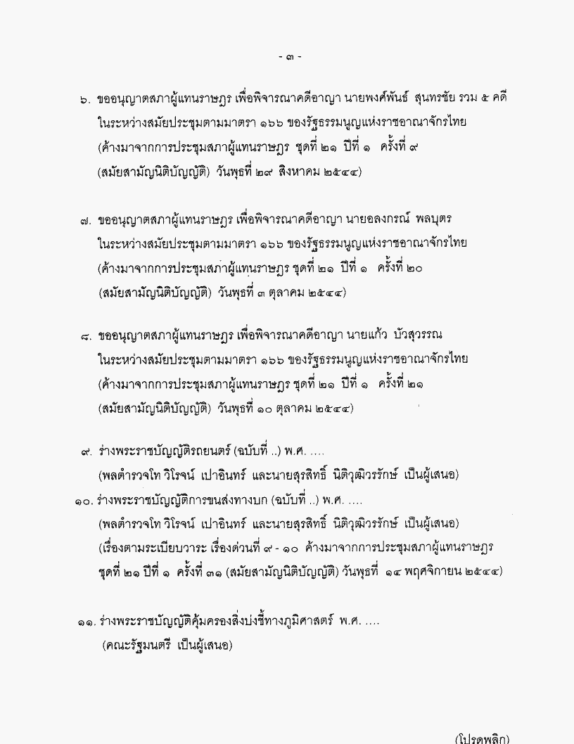 • ระเบียบวาระการประชุมสภาผู้แทนราษฎร ชุดที่ 21 ปีที่ 1 ครั้งที่ 35 (สมัยสามัญนิติบัญญัติ) วันพุธที่ 28 พฤศจิกายน 2544