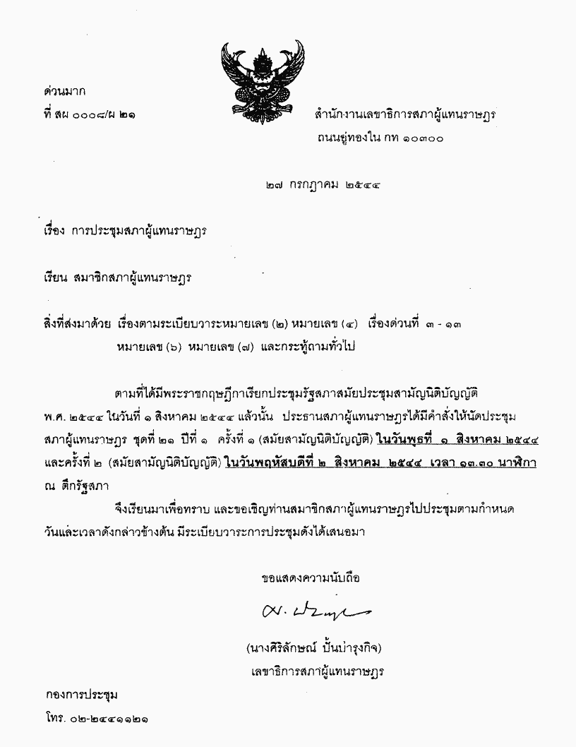 • ระเบียบวาระการประชุมสภาผู้แทนราษฎร ชุดที่ 21 ปีที่ 1 ครั้งที่ 1 (สมัยสามัญนิติบัญญัติ) วันพุธที่ 1 สิงหาคม 2544
