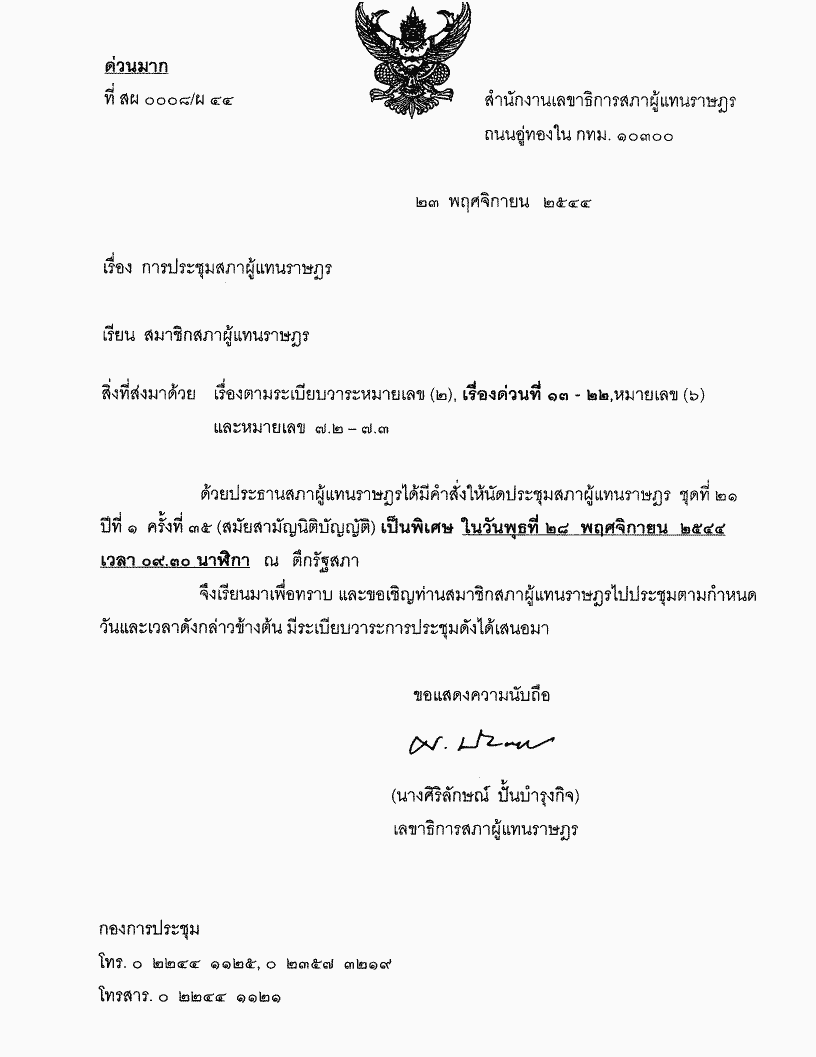 • ระเบียบวาระการประชุมสภาผู้แทนราษฎร ชุดที่ 21 ปีที่ 1 ครั้งที่ 35 (สมัยสามัญนิติบัญญัติ) วันพุธที่ 28 พฤศจิกายน 2544