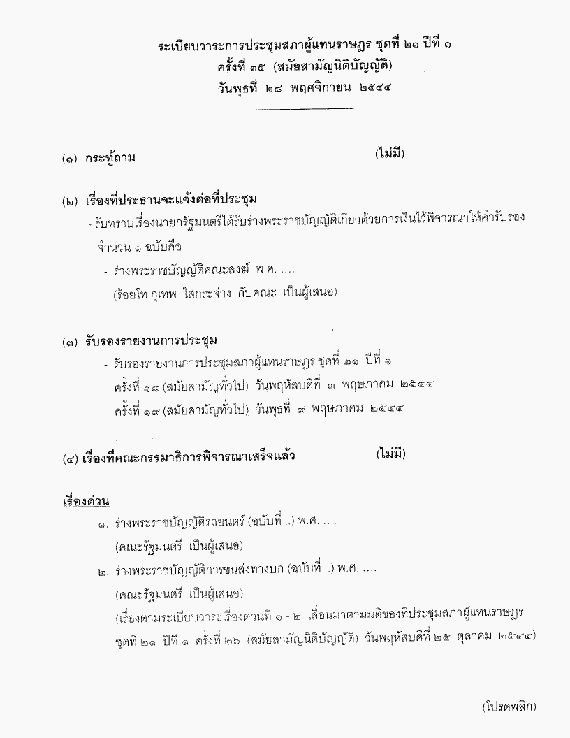 • ระเบียบวาระการประชุมสภาผู้แทนราษฎร ชุดที่ 21 ปีที่ 1 ครั้งที่ 35 (สมัยสามัญนิติบัญญัติ) วันพุธที่ 28 พฤศจิกายน 2544
