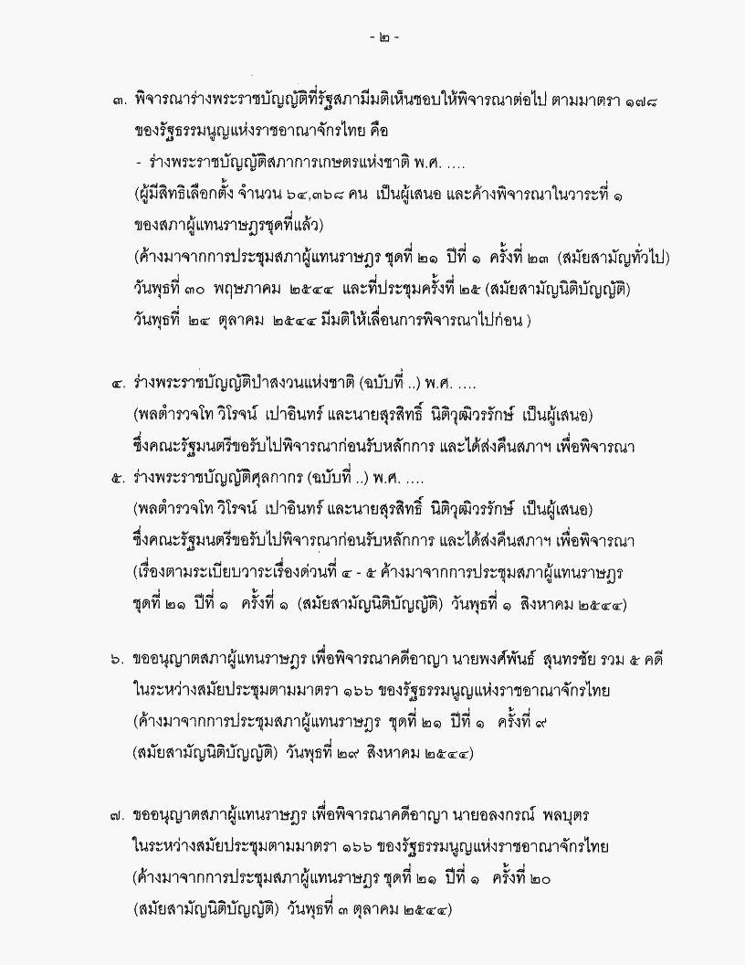 • ระเบียบวาระการประชุมสภาผู้แทนราษฎร ชุดที่ 21 ปีที่ 1 ครั้งที่ 35 (สมัยสามัญนิติบัญญัติ) วันพุธที่ 28 พฤศจิกายน 2544
