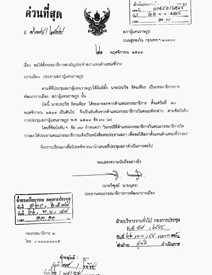 ตั้งช่อมกรรมาธิการสามัญประจำสภา ในคณะกรรมาธิการการพัฒนาการเมืองแทนตำแหน่งที่ว่างลง 1 ตำแหน่ง เพราะลาออก (นายประวิช รัตนเพียร) |