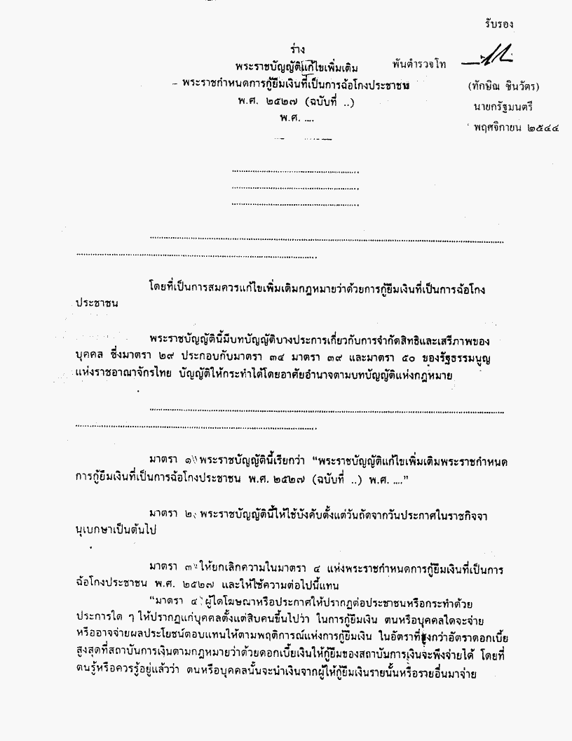ชื่อเอกสาร :   ร่างพระราชบัญญัติแก้ไขเพิ่มเติมพระราชกำหนดการกู้ยืมเงินที่เป็นการฉ้อโกงประชาชน พ.ศ. 2527 (ฉบับที่..) พ.ศ..... (พลตำรวจโท วิโรจน์ เปาอินทร์ และนางสาวกัญจนา ศิลปอาชา เป็นผู้เสนอ)