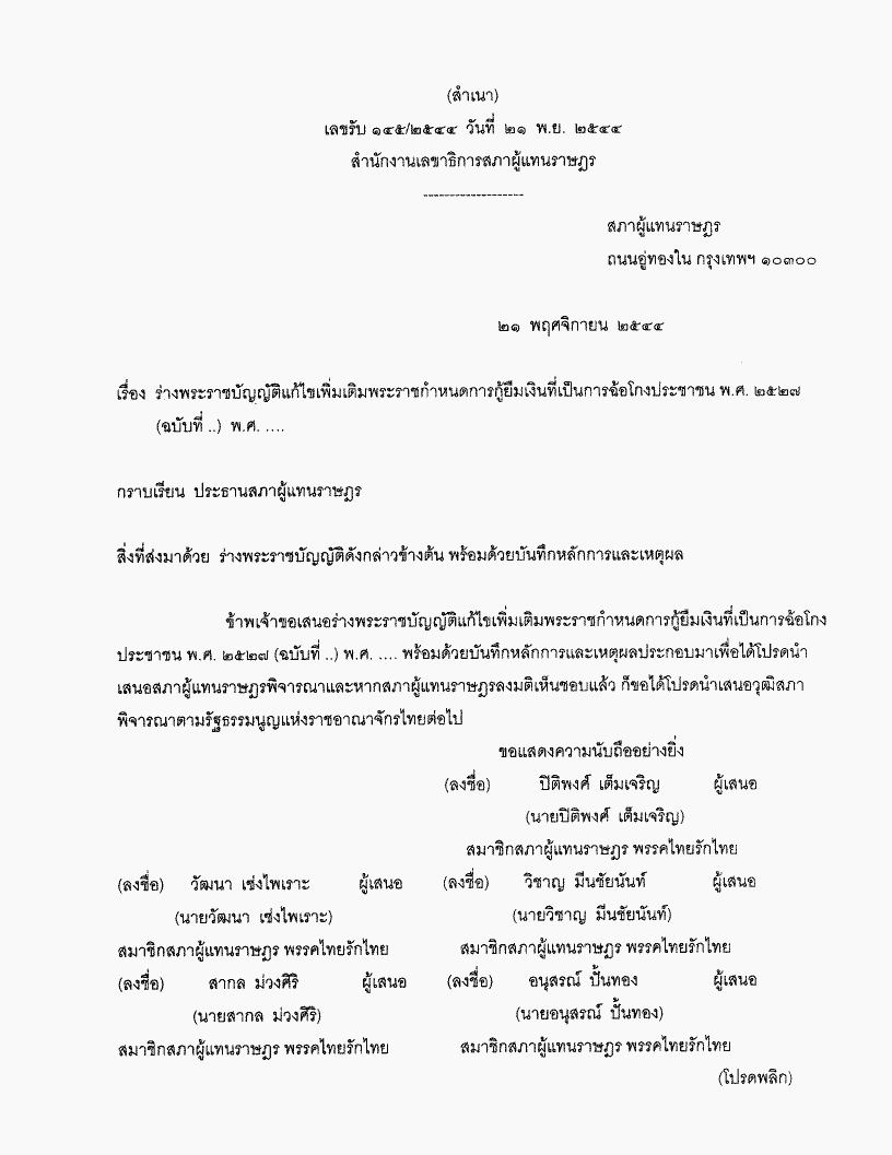 ร่างพระราชบัญญัติแก้ไขเพิ่มเติมพระราชกำหนดการกู้ยืมเงินที่เป็นการฉ้อโกงประชาชน พ.ศ. 2527 (ฉบับที่ ..) พ.ศ..... (นายปิติพงศ์ เต็มเจริญ กับคณะ เป็นผู้เสนอ) |