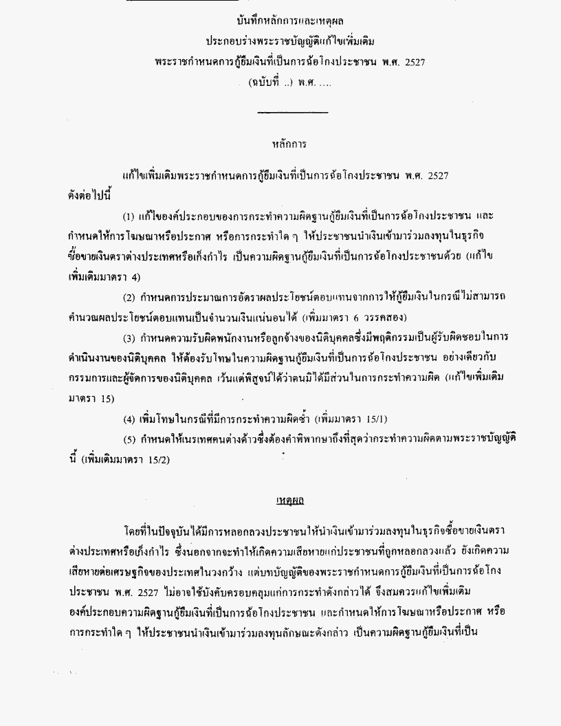 ชื่อเอกสาร :   ร่างพระราชบัญญัติแก้ไขเพิ่มเติมพระราชกำหนดการกู้ยืมเงินที่เป็นการฉ้อโกงประชาชน พ.ศ. 2527 (ฉบับที่ ..) พ.ศ..... (นายปิติพงศ์ เต็มเจริญ กับคณะ เป็นผู้เสนอ)