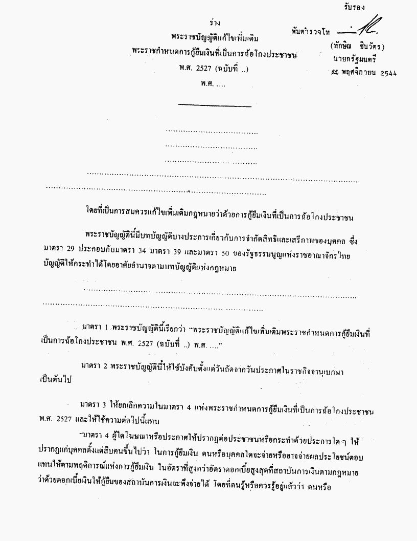 • ร่างพระราชบัญญัติแก้ไขเพิ่มเติมพระราชกำหนดการกู้ยืมเงินที่เป็นการฉ้อโกงประชาชน พ.ศ. 2527 (ฉบับที่ ..) พ.ศ..... (นายปิติพงศ์ เต็มเจริญ กับคณะ เป็นผู้เสนอ)