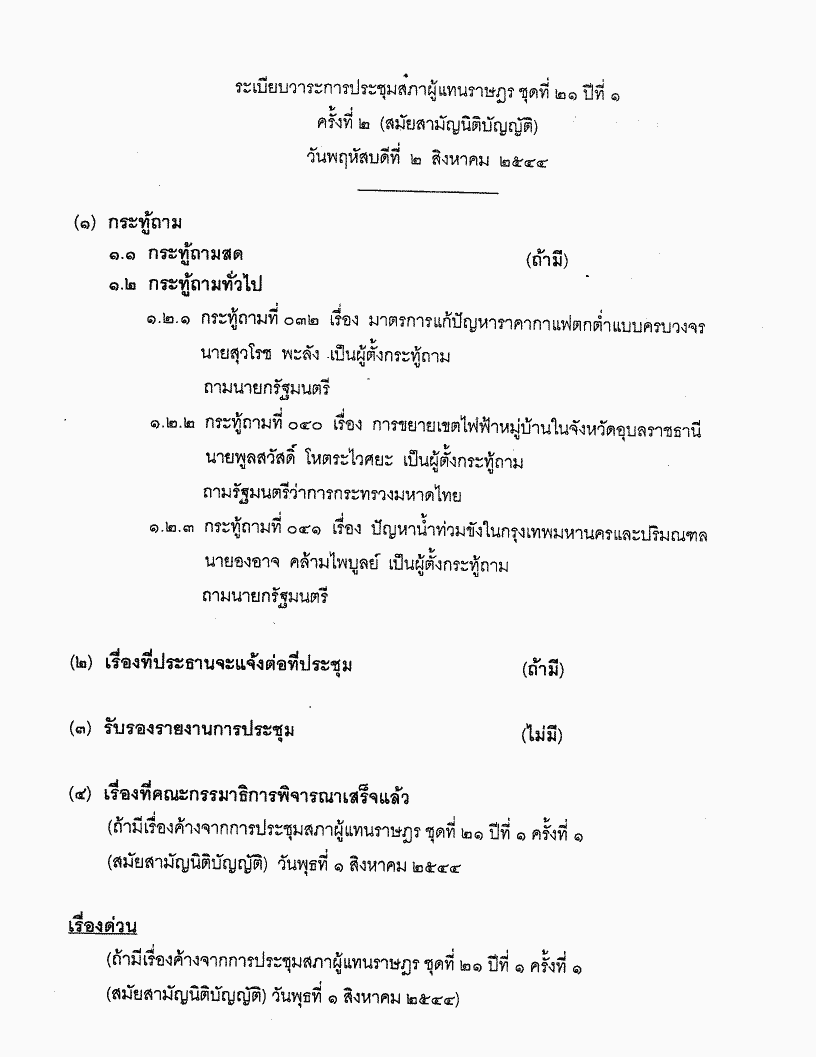 ระเบียบวาระการประชุมสภาผู้แทนราษฎร ชุดที่ 21 ปีที่ 1 ครั้งที่ 2 (สมัยสามัญนิติบัญญัติ) วันพฤหัสบดีที่ 2 สิงหาคม 2544 |