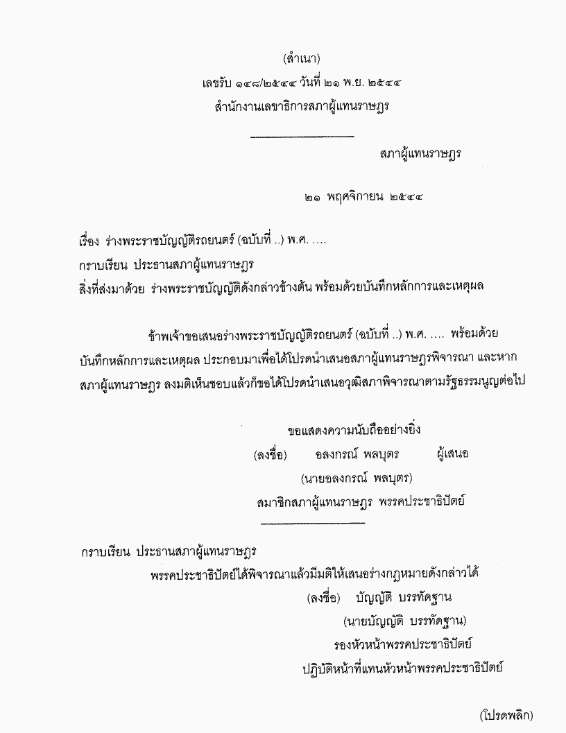 • ร่างพระราชบัญญัติรถยนตร์ (ฉบับที่..) พ.ศ..... (นายอลงกรณ์ พลบุตร เป็นผู้เสนอ)