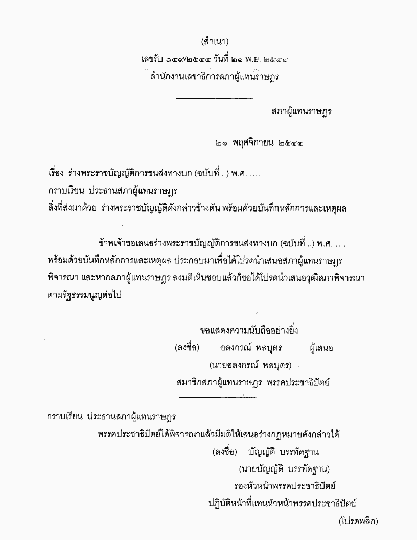 ชื่อเอกสาร : ร่างพระราชบัญญัติการขนส่งทางบก (ฉบับที่..) พ.ศ..... (นายอลงกรณ์ พลบุตร เป็นผู้เสนอ)