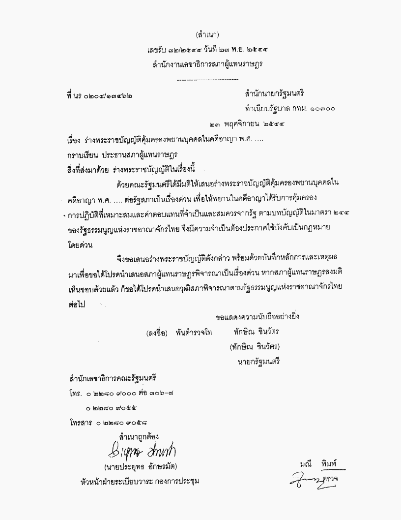 • ร่างพระราชบัญญัติคุ้มครองพยานบุคคลในคดีอาญา พ..ศ. .... (คณะรัฐมนตรี เป็นผู้เสนอ)