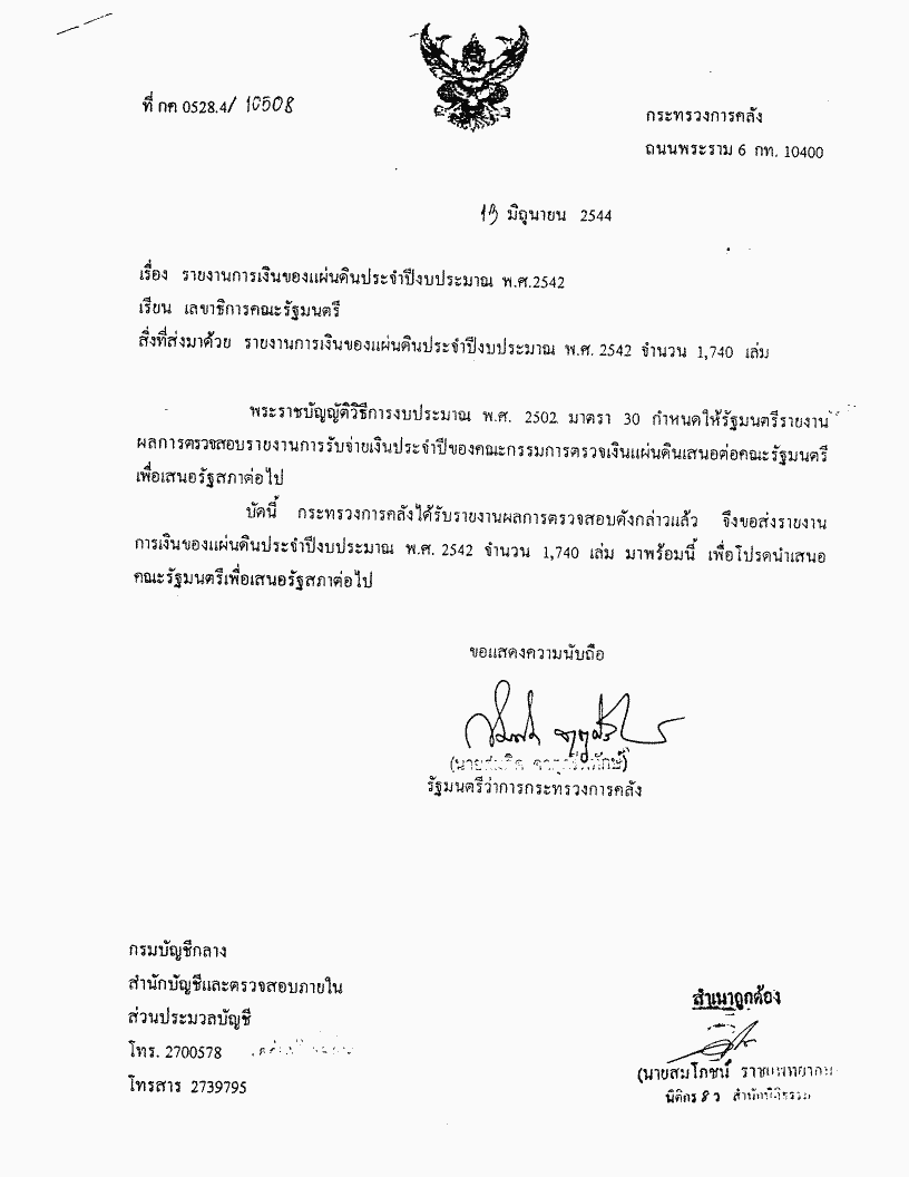 • รับทราบรายงานผลการตรวจสอบรายงานการเงินของแผ่นดินประจำปีงบประมาณ พ.ศ. 2542 ของกระทรวงการคลัง