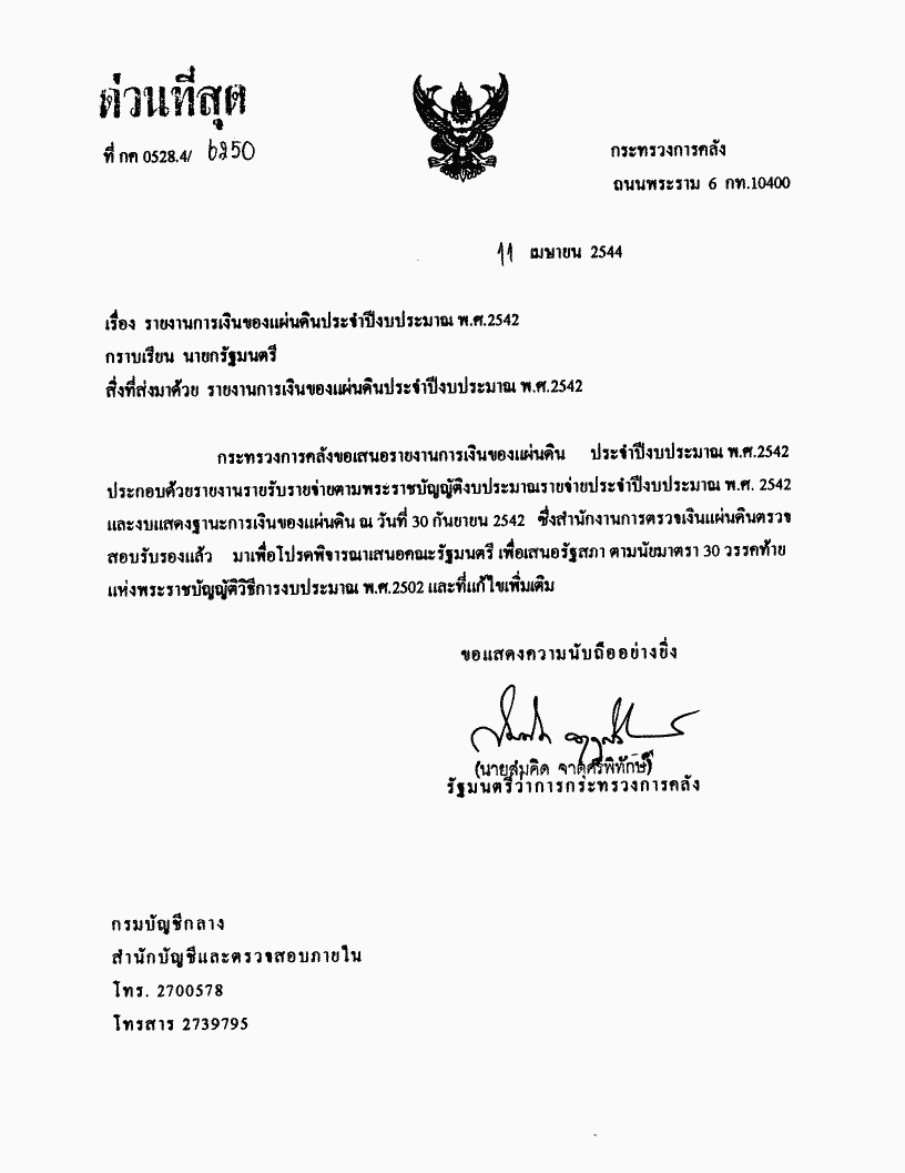 • รับทราบรายงานผลการตรวจสอบรายงานการเงินของแผ่นดินประจำปีงบประมาณ พ.ศ. 2542 ของกระทรวงการคลัง