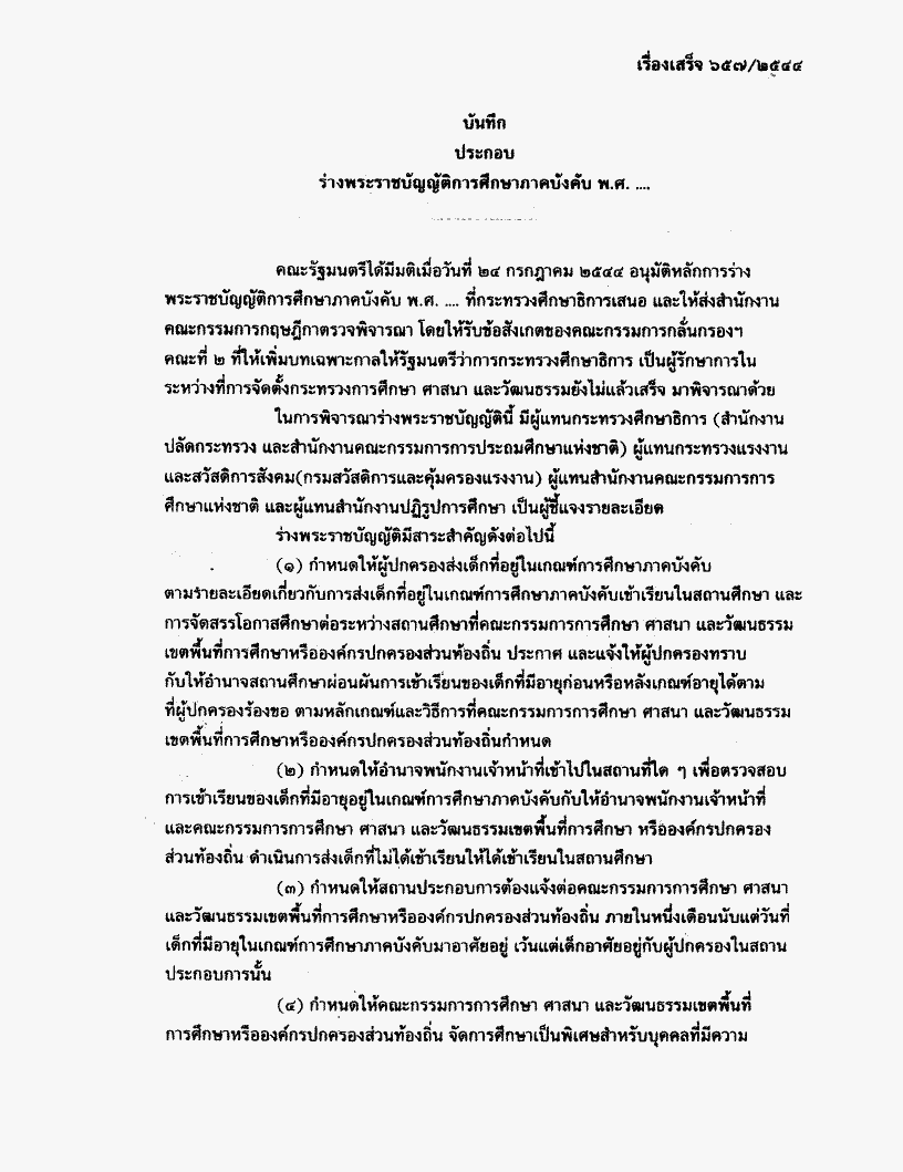 • ร่างพระราชบัญญัติการศึกษาภาคบังคับ พ.ศ..... (คณะรัฐมนตรี เป็นผู้เสนอ)
