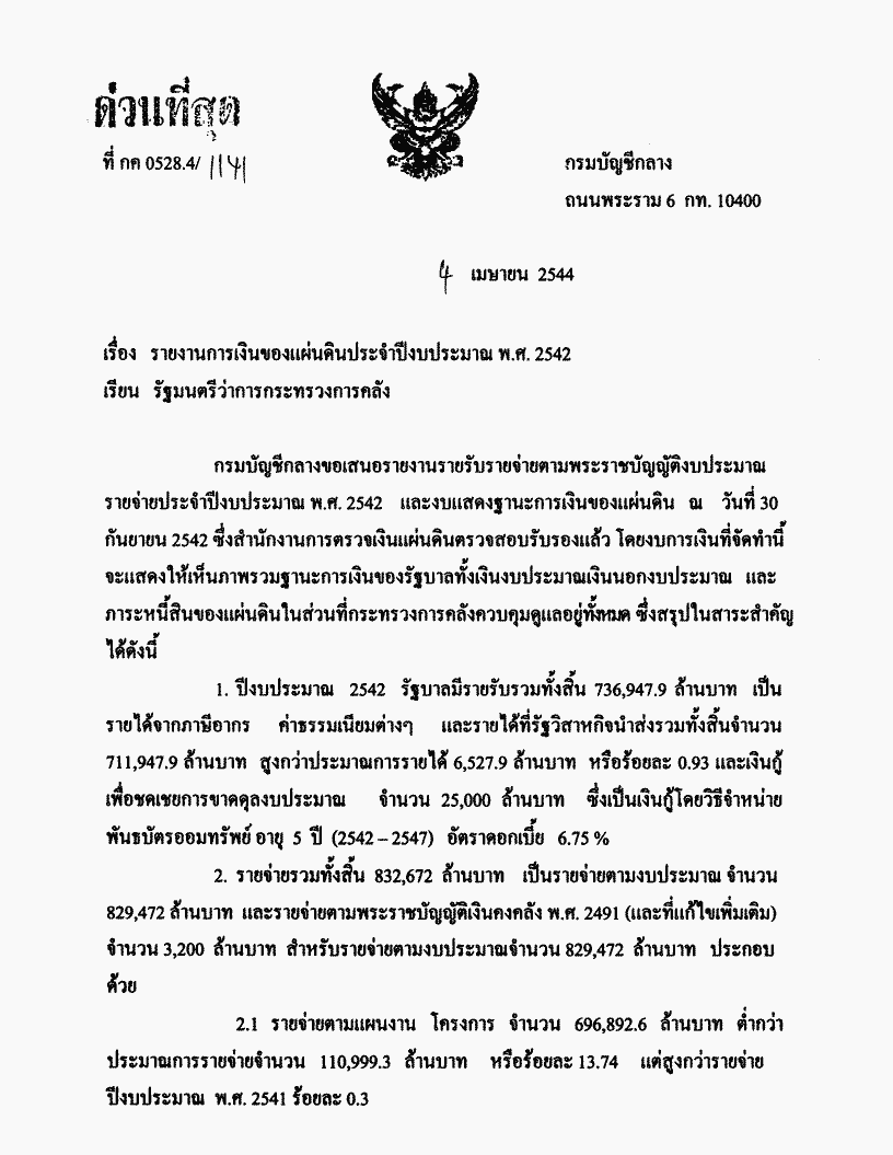 • รายงานผลการตรวจสอบรายงานการเงินของแผ่นดินประจำปีงบประมาณ พ.ศ. 2542