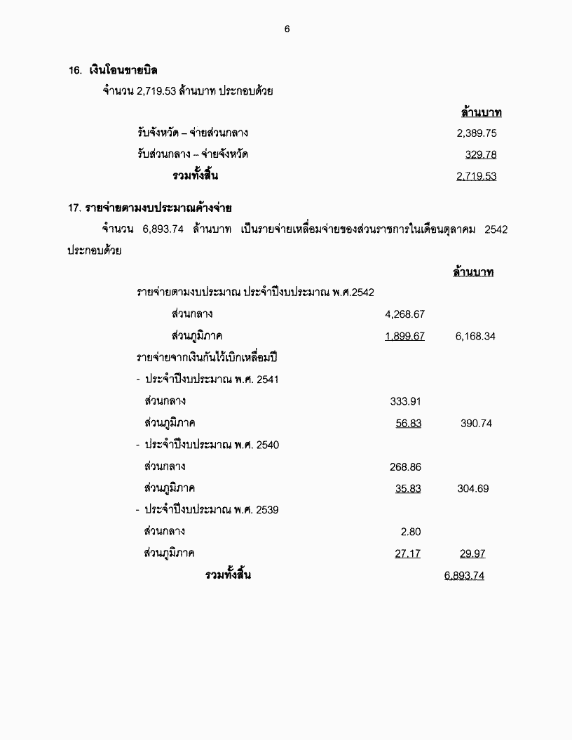 • รับทราบรายงานผลการตรวจสอบรายงานการเงินของแผ่นดินประจำปีงบประมาณ พ.ศ. 2542 ของกระทรวงการคลัง
