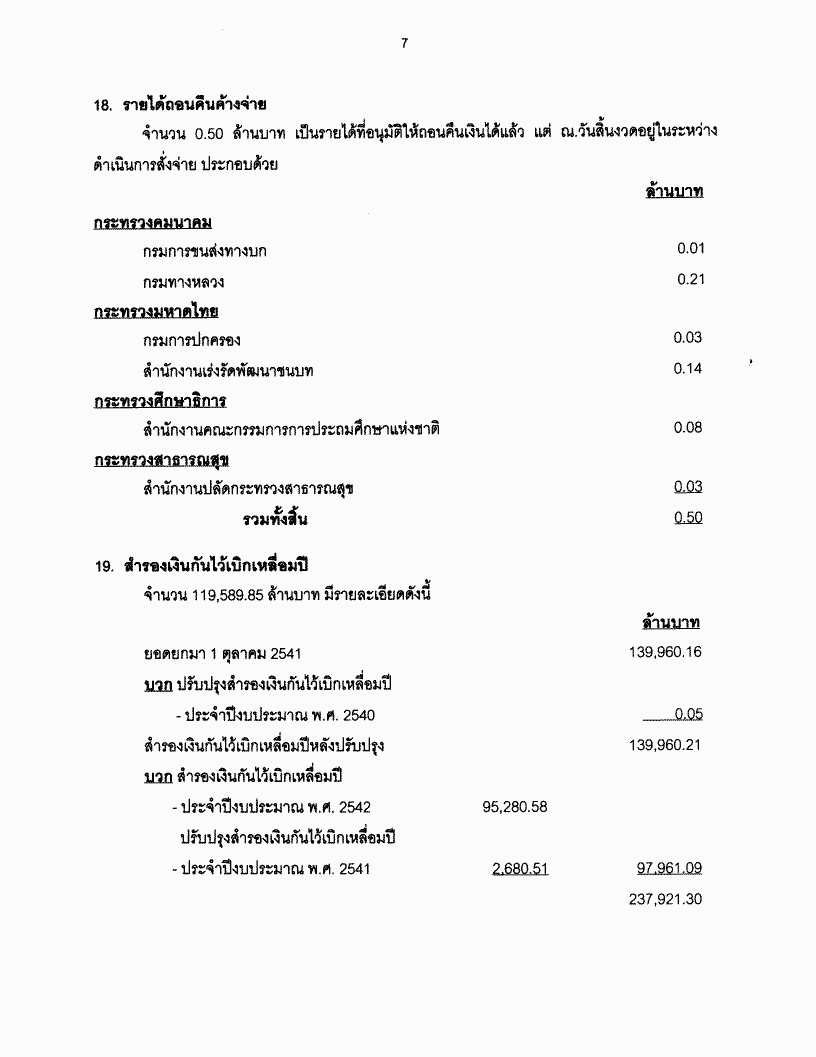 • รับทราบรายงานผลการตรวจสอบรายงานการเงินของแผ่นดินประจำปีงบประมาณ พ.ศ. 2542 ของกระทรวงการคลัง