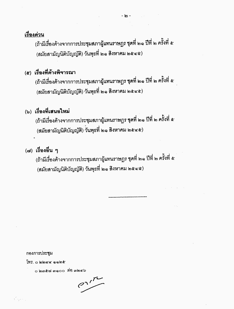 • ระเบียบวาระการประชุมสภาผู้แทนราษฎร ชุดที่ 21 ปีที่ 2 ครั้งที่ 6 (สมัยสามัญนิติบัญญัติ) วันพฤหัสบดีที่ 22 สิงหาคม 2545