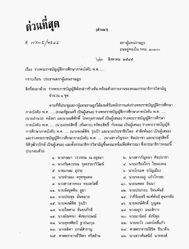 • ร่างพระราชบัญญัติการศึกษาภาคบังคับ พ.ศ.....ซึ่งคณะกรรมาธิการวิสามัญพิจารณาเสร็จแล้ว