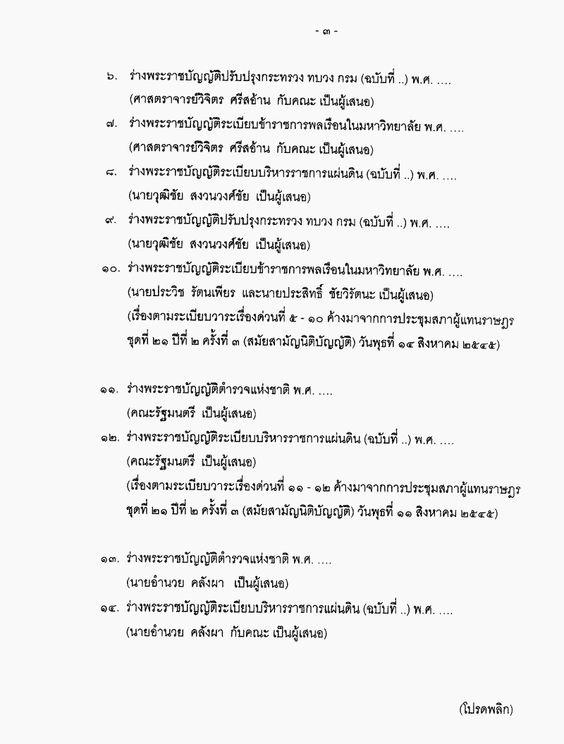 • ระเบียบวาระการประชุมสภาผู้แทนราษฎร ชุดที่ 21 ปีที่ 2 ครั้งที่ 12 (สมัยสามัญนิติบัญญัติ) วันพุธที่ 11 กันยายน 2545