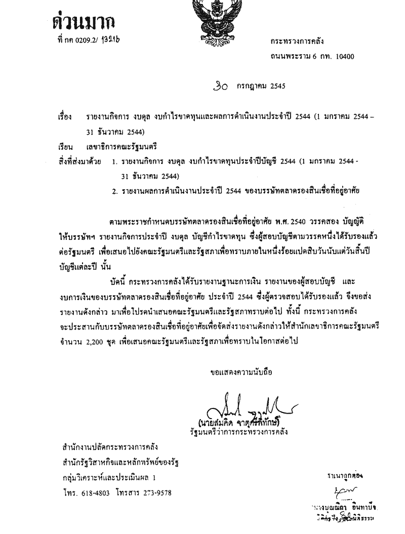 • รับทราบรายงานกิจการ งบดุล งบกำไรขาดทุนและผลการดำเนินงานประจำปี 2544 (1 มกราคม 2544- 31 ธันวาคม 2544) ของบรรษัทตลาดรองสินเชื่อที่อยู่อาศัย