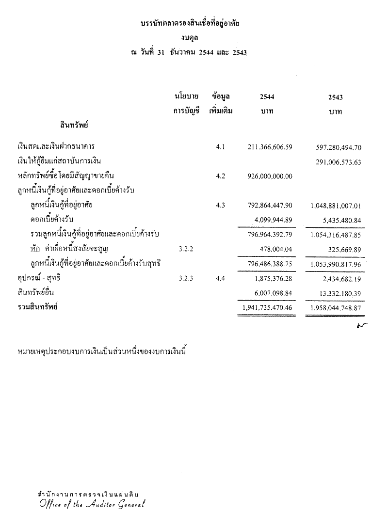 • รายงานกิจการ งบดุล งบกำไรขาดทุนและผลการดำเนินงานประจำปี 2544 (1 มกราคม 2544- 31 ธันวาคม 2544) ของบรรษัทตลาดรองสินเชื่อที่อยู่อาศัย