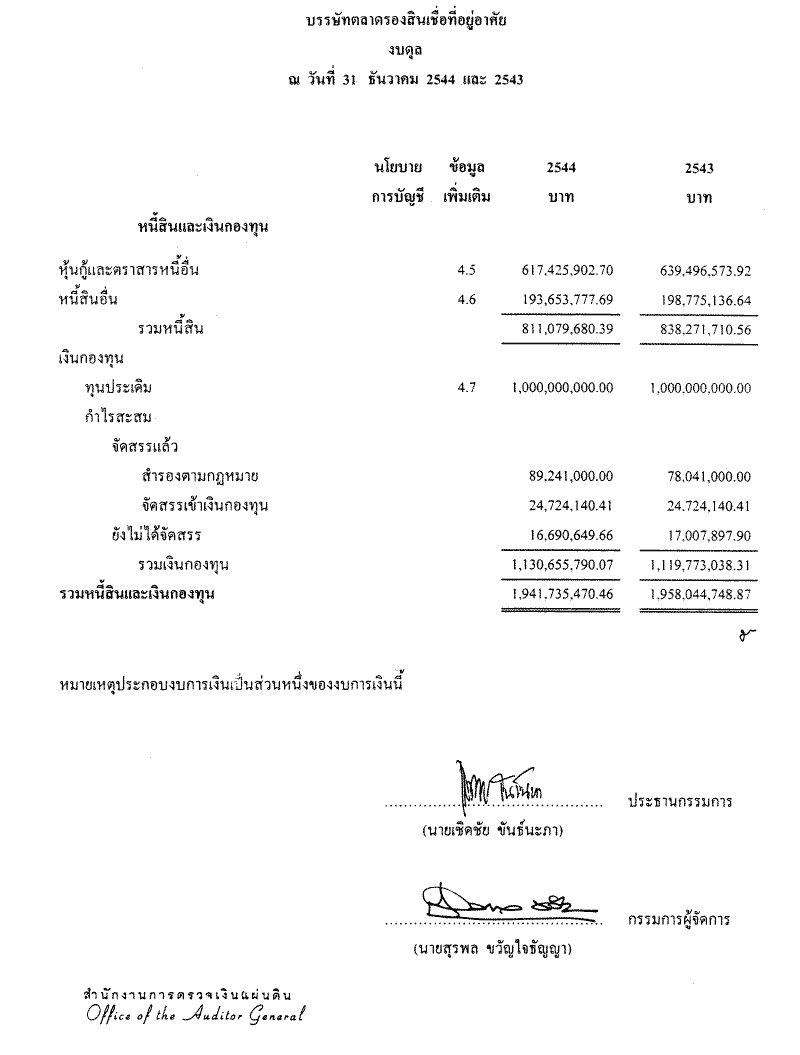 • รายงานกิจการ งบดุล งบกำไรขาดทุนและผลการดำเนินงานประจำปี 2544 (1 มกราคม 2544- 31 ธันวาคม 2544) ของบรรษัทตลาดรองสินเชื่อที่อยู่อาศัย