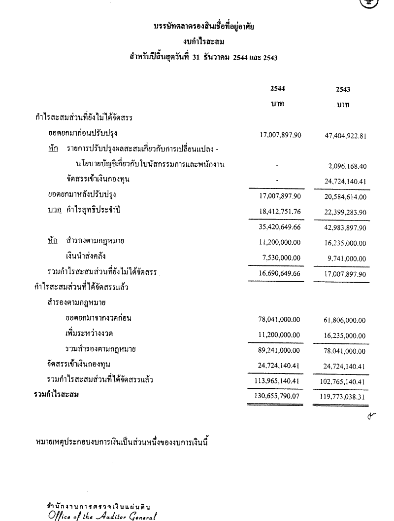 • รายงานกิจการ งบดุล งบกำไรขาดทุนและผลการดำเนินงานประจำปี 2544 (1 มกราคม 2544- 31 ธันวาคม 2544) ของบรรษัทตลาดรองสินเชื่อที่อยู่อาศัย