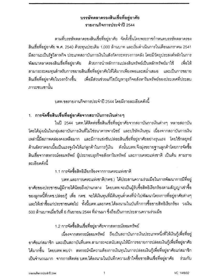 ชื่อเอกสาร :   รับทราบรายงานกิจการ งบดุล งบกำไรขาดทุนและผลการดำเนินงานประจำปี 2544 (1 มกราคม 2544- 31 ธันวาคม 2544) ของบรรษัทตลาดรองสินเชื่อที่อยู่อาศัย