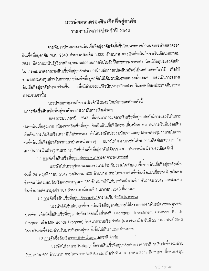 • รายงานกิจการ งบดุล งบกำไรขาดทุน และผลการดำเนินงานประจำปี 2543 (1 มกราคม 2543 - 31 ธันวาคม 2543) ของบรรษัทตลาดรองสินเชื่อที่อยู่อาศัย