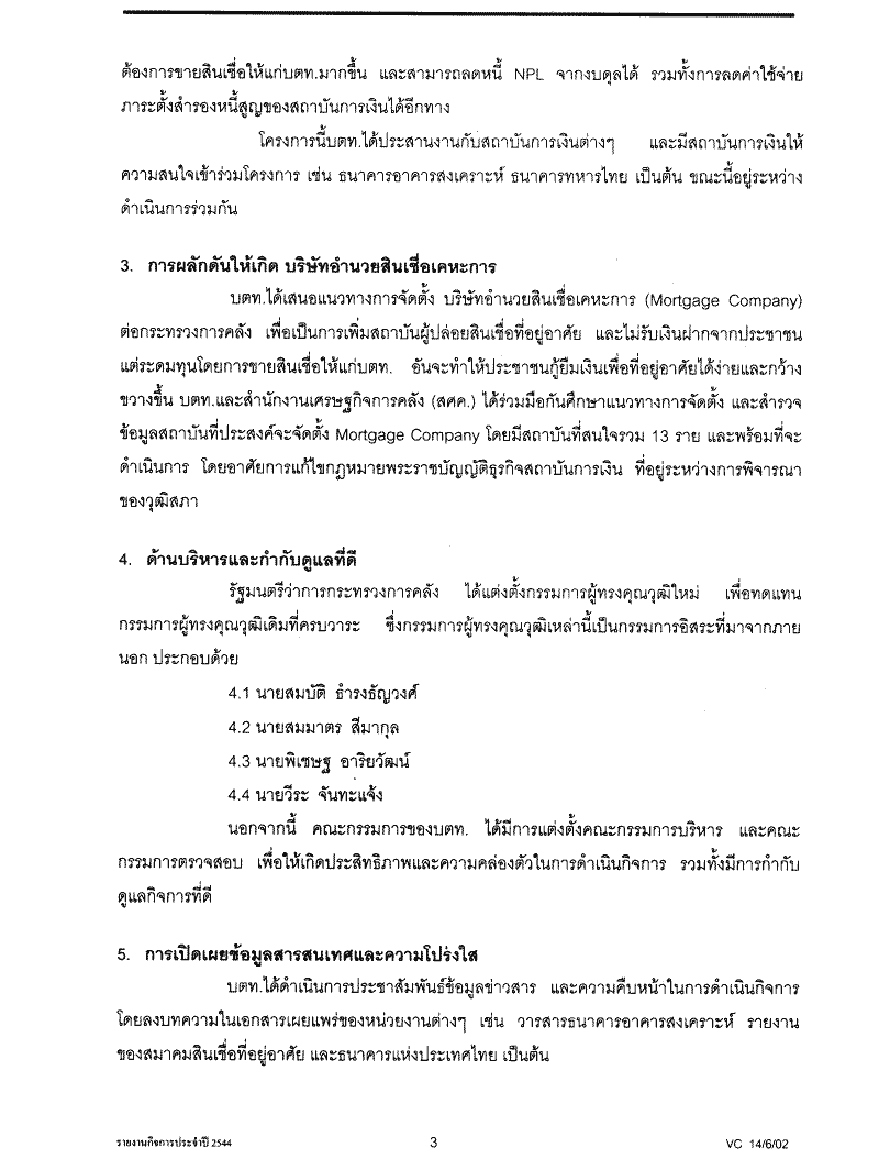 • รับทราบรายงานกิจการ งบดุล งบกำไรขาดทุนและผลการดำเนินงานประจำปี 2544 (1 มกราคม 2544- 31 ธันวาคม 2544) ของบรรษัทตลาดรองสินเชื่อที่อยู่อาศัย