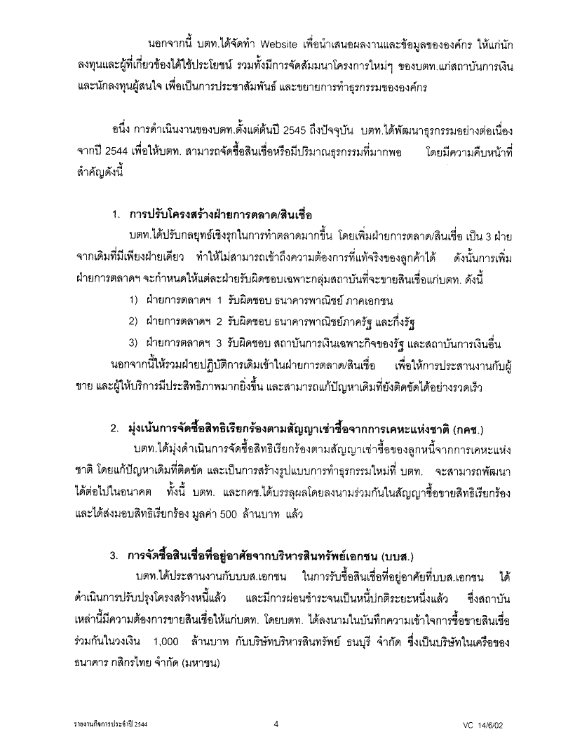 ชื่อเอกสาร :   รับทราบรายงานกิจการ งบดุล งบกำไรขาดทุนและผลการดำเนินงานประจำปี 2544 (1 มกราคม 2544- 31 ธันวาคม 2544) ของบรรษัทตลาดรองสินเชื่อที่อยู่อาศัย
