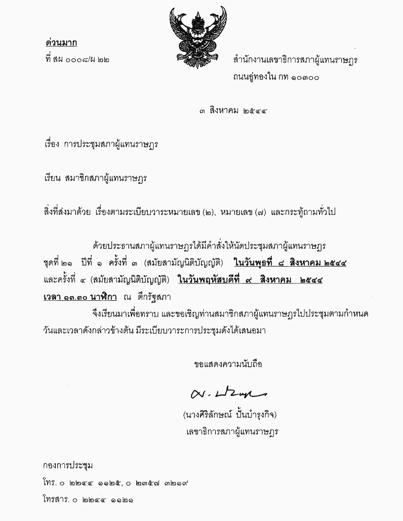 • ระเบียบวาระการประชุมสภาผู้แทนราษฎร ชุดที่ 21 ปีที่ 1 ครั้งที่ 3 (สมัยสามัญนิติบัญญัติ) วันพุธที่ 8 สิงหาคม 2544