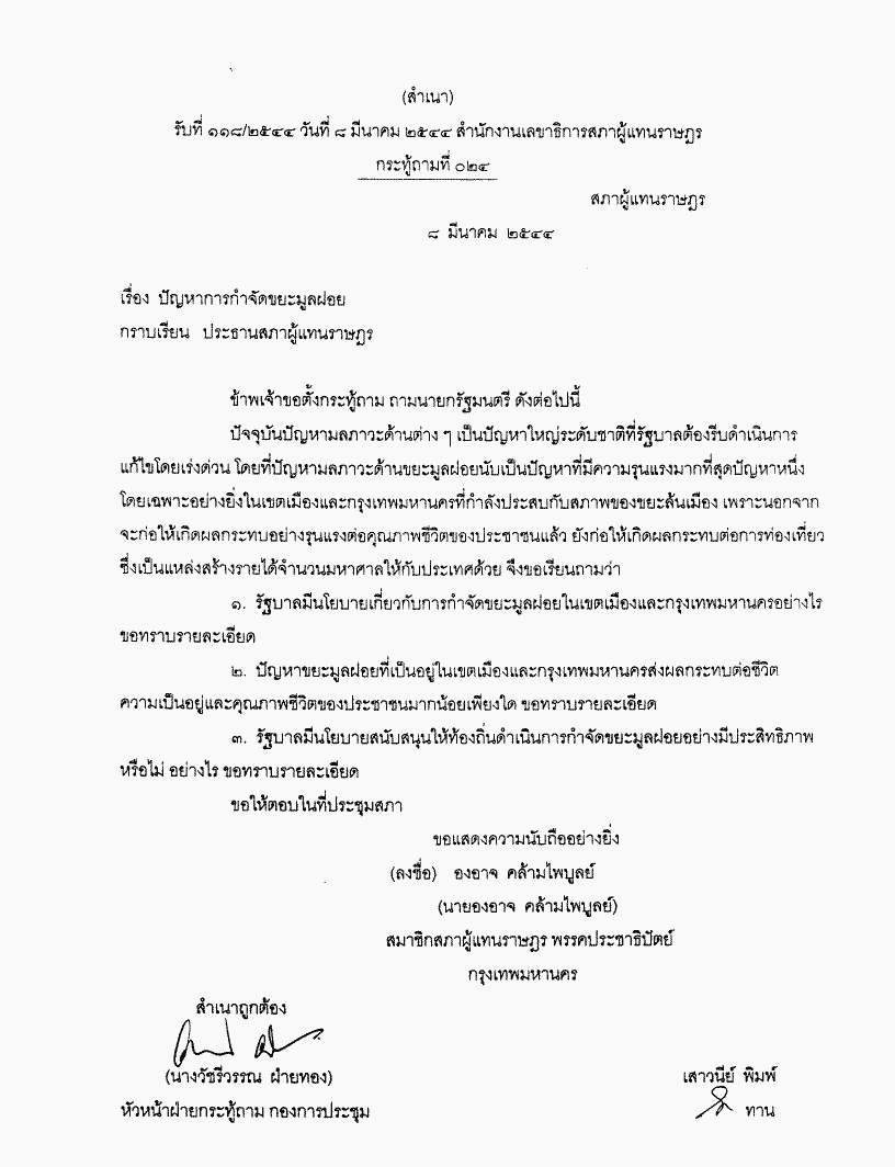 ๑.๒.๓ กระทู้ถาม เรื่อง ปัญหาการกำจัดขยะมูลฝอย นายองอาจ คล้ามไพบูลย์ เป็นผู้ตั้งกระทู้ถาม ถามนายกรัฐมนตรี |