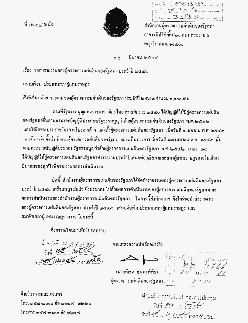 ขอส่งรายงานของผู้ตรวจการแผ่นดินของรัฐสภา ประจำปี ๒๕๔๓ |