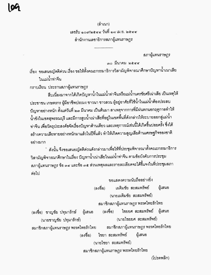ขอเสนอญัตติด่วน เรื่อง ขอให้ตั้งคณะกรรมาธิการวิสามัญพิจารณาศึกษาปัญหาน้ำเน่าเสียในแม่น้ำท่าจีน |