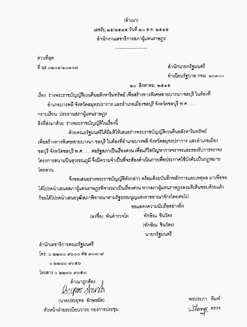 • ร่างพระราชบัญญัติเวนคืนอสังหาริมทรัพย์ เพื่อสร้างทางพิเศษสายบางนา-ชลบุรี ในท้องที่อำเภอบางพลี จังหวัดสมุทรปราการ และอำเภอเมืองชลบุรี จังหวัดชลบุรี พ.ศ. ....