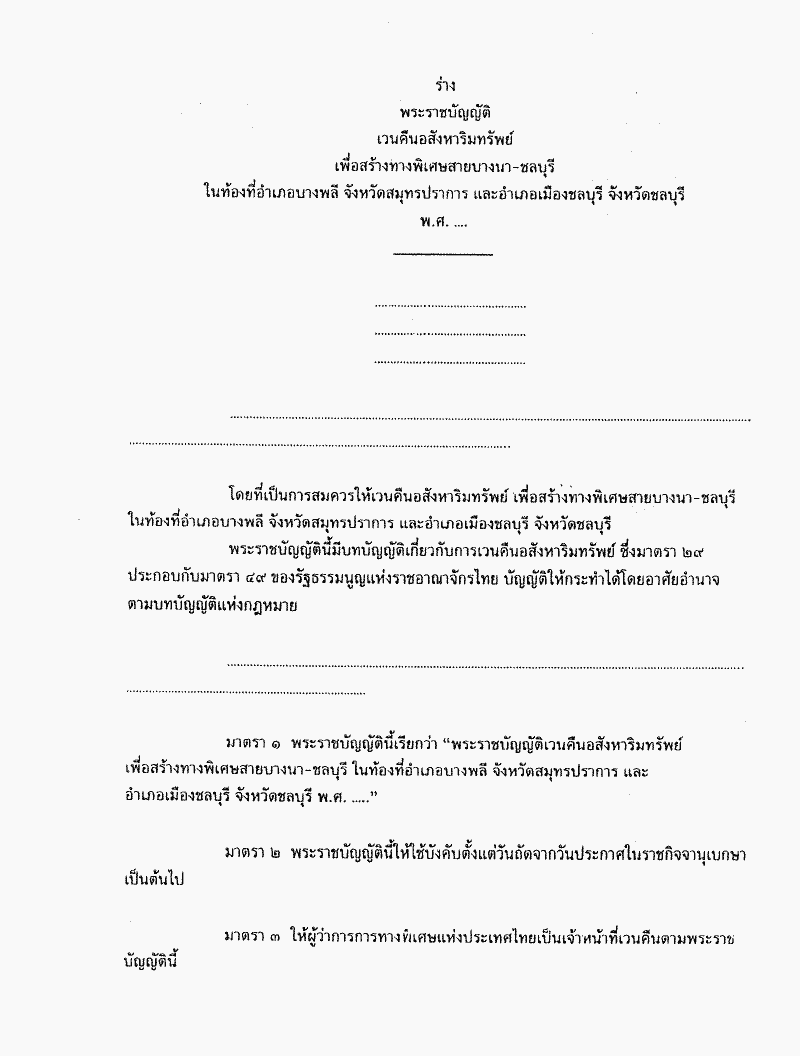 ร่างพระราชบัญญัติเวนคืนอสังหาริมทรัพย์ เพื่อสร้างทางพิเศษสายบางนา-ชลบุรี ในท้องที่อำเภอบางพลี จังหวัดสมุทรปราการ และอำเภอเมืองชลบุรี จังหวัดชลบุรี พ.ศ. .... |