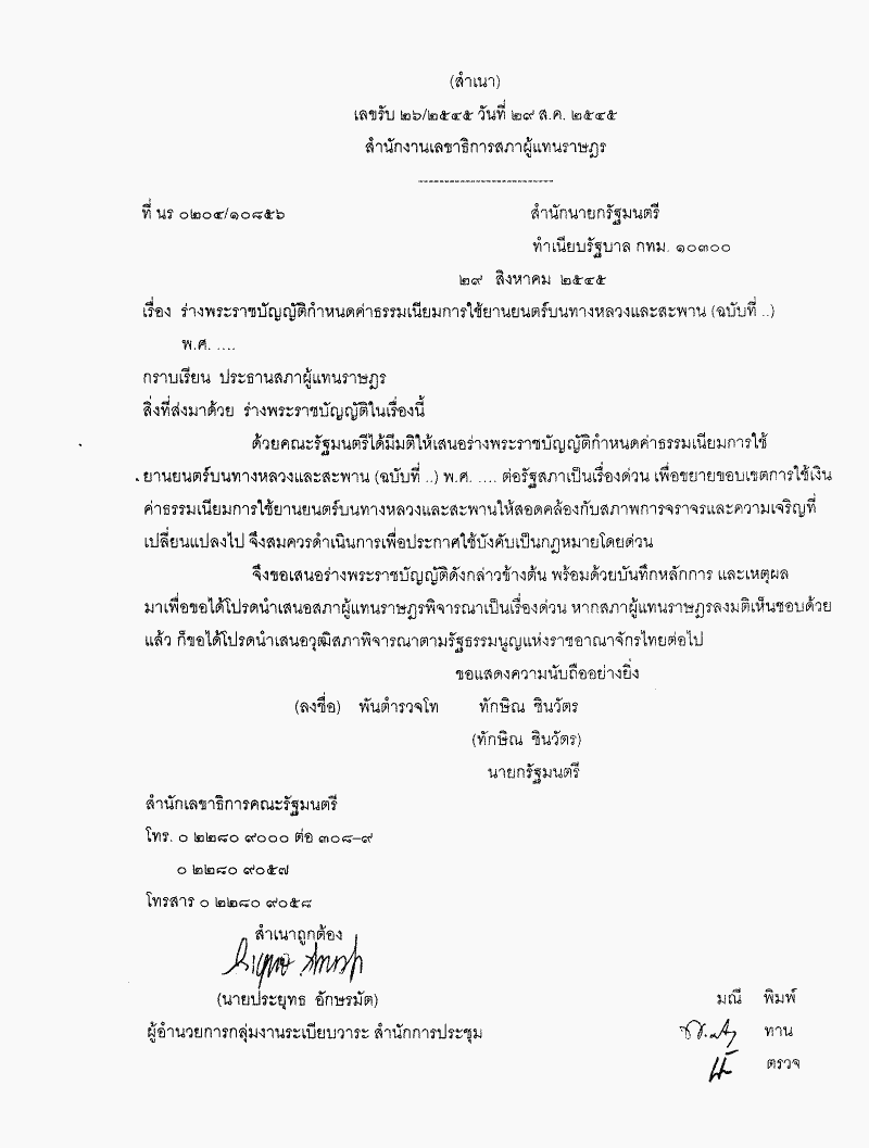 • ร่างพระราชบัญญัติกำหนดค่าธรรมเนียมการใช้ยานยนตร์บนทางหลวงและสะพาน ( ฉบับที่.. ) พ.ศ. .... (คณะรัฐมนตรี เป็นผู้เสนอ)