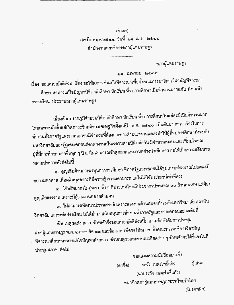 ขอเสนอญัตติด่วน เรื่อง ขอให้สภาฯ ร่วมกันพิจารณาเพื่อตั้งคณะกรรมาธิการวิสามัญพิจารณาศึกษา หาทางแก้ไขปัญหานิสิต นักศึกษา นักเรียน ที่จบการศึกษาเป็นจำนวนมากแต่ไม่มีงานทำ |