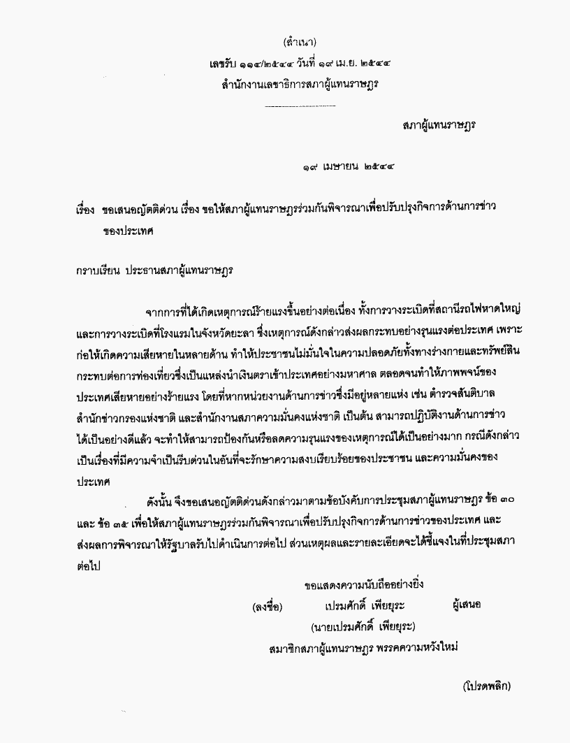 ขอเสนอญัตติด่วน เรื่อง ขอให้สภาผู้แทนราษฎรร่วมกันพิจารณาเพื่อปรับปรุงกิจการด้านการข่าวของประเทศ |