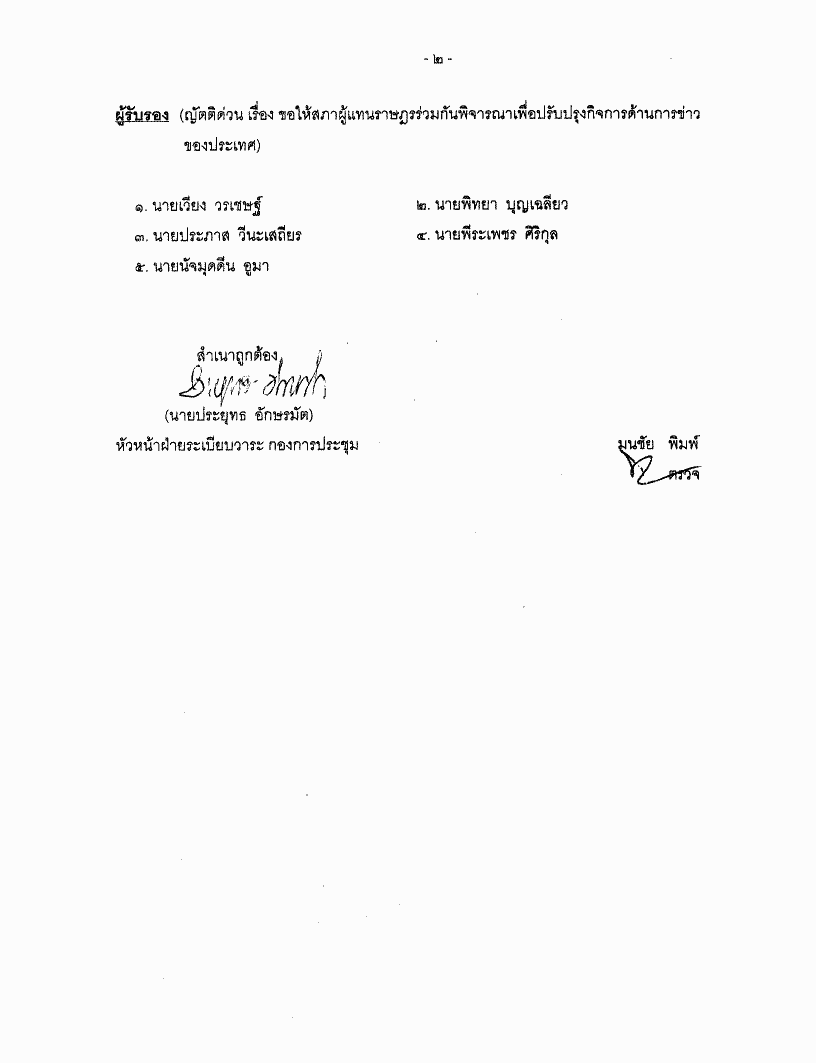 ชื่อเอกสาร :   ญัตติ เรื่อง ขอให้สภาผู้แทนราษฎรร่วมกันพิจารณาเพื่อปรับปรุงกิจการด้านการข่าวของประเทศ (นายเปรมศักดิ์ เพียยุระ เป็นผู้เสนอ)