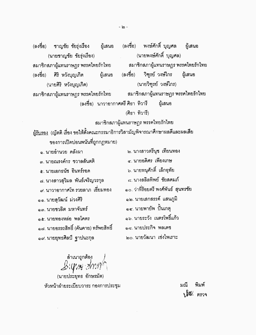 ขอเสนอญัตติ เรื่อง ขอให้ตั้งคณะกรรมาธิการวิสามัญพิจารณาศึกษาผลดีและผลเสียของการเปิดบ่อนพนันที่ถูกกฎหมาย |