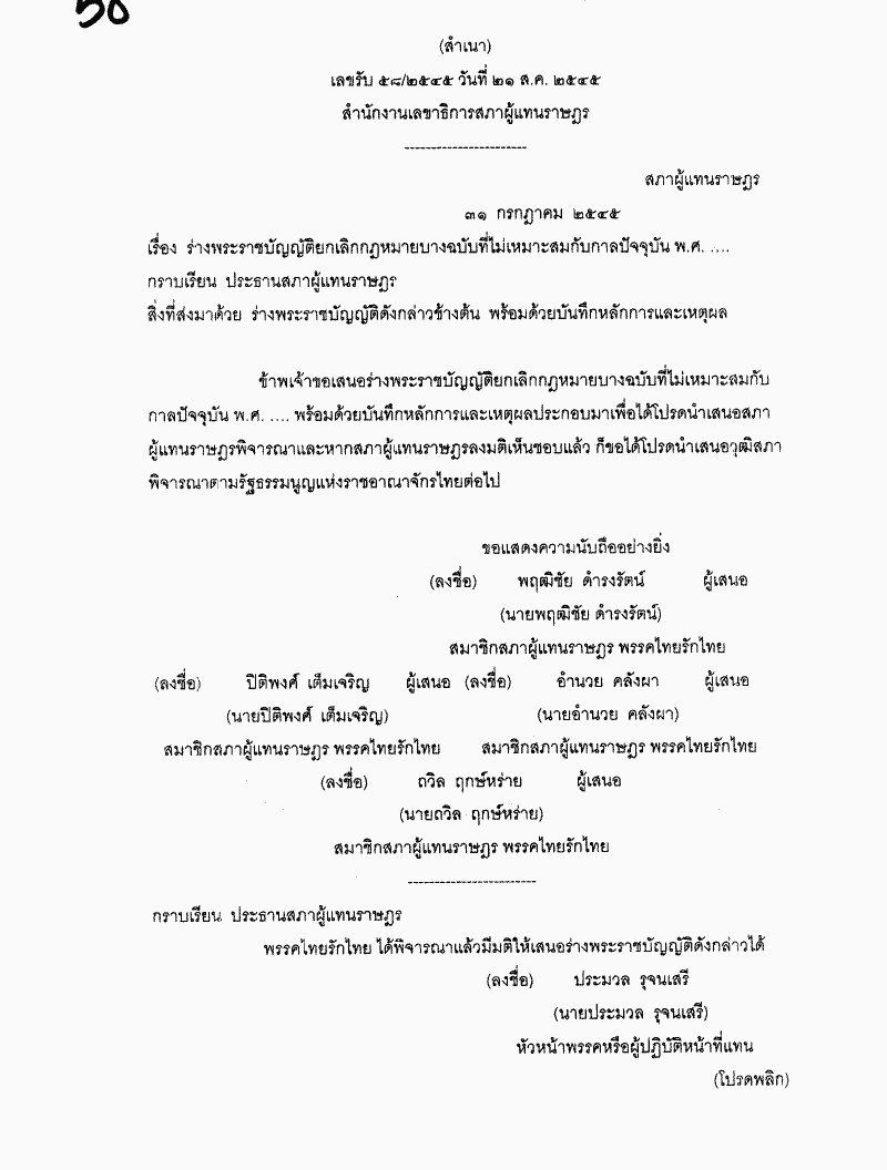 • ร่างพระราชบัญญัติยกเลิกกฎหมายบางฉบับที่ไม่เหมาะสมกับกาลปัจจุบัน พ.ศ. .... (นายพฤฒิชัย ดำรงรัตน์ กับคณะ เป็นผู้เสนอ)
