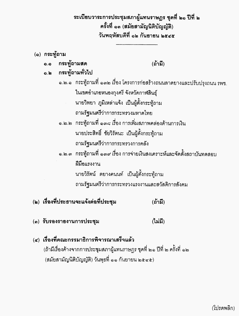 ระเบียบวาระการประชุมสภาผู้แทนราษฎร ชุดที่ 21 ปีที่ 2 ครั้งที่ 13 (สมัยสามัญนิติบัญญัติ) วันพฤหัสบดีที่ 12 กันยายน 2545 |