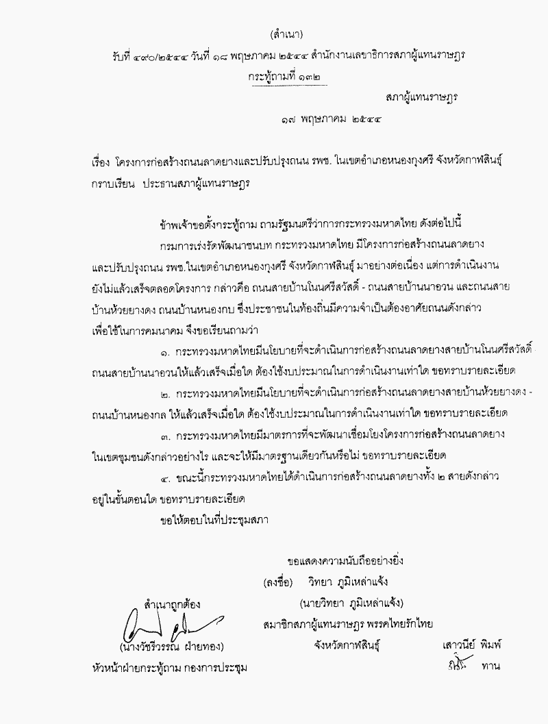 กระทู้ถามที่ 132 เรื่อง โครงการก่อสร้างถนนลาดยางและปรับปรุงถนน รพช.ในเขตอำเภอหนองกุงศรี จังหวัดกาฬสินธุ์ นายวิทยา ภูมิเหล่าแจ้ง เป็นผู้ตั้งกระทู้ถาม ถามรัฐมนตรีว่าการกระทรวงมหาดไทย |