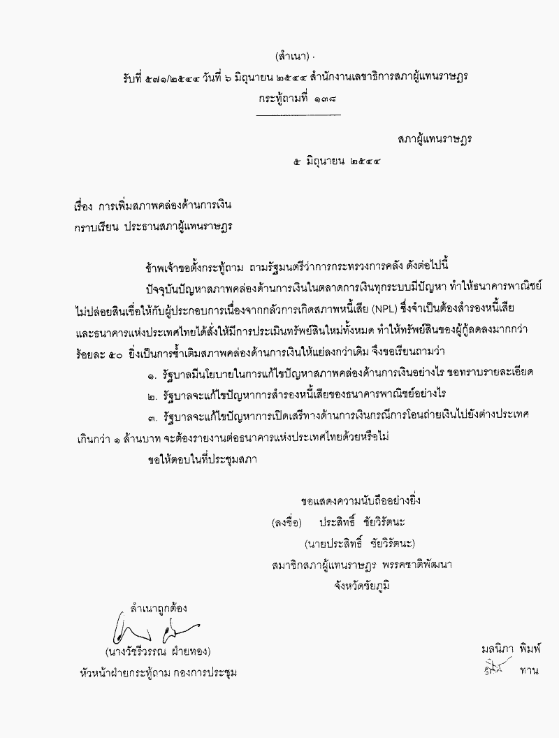 กระทู้ถามที่ 138 เรื่อง การเพิ่มสภาพคล่องด้านการเงิน นายประสิทธิ์ ชัยวิรัตนะ เป็นผู้ตั้งกระทู้ถาม ถามรัฐมนตรีว่าการกระทรวงการคลัง |