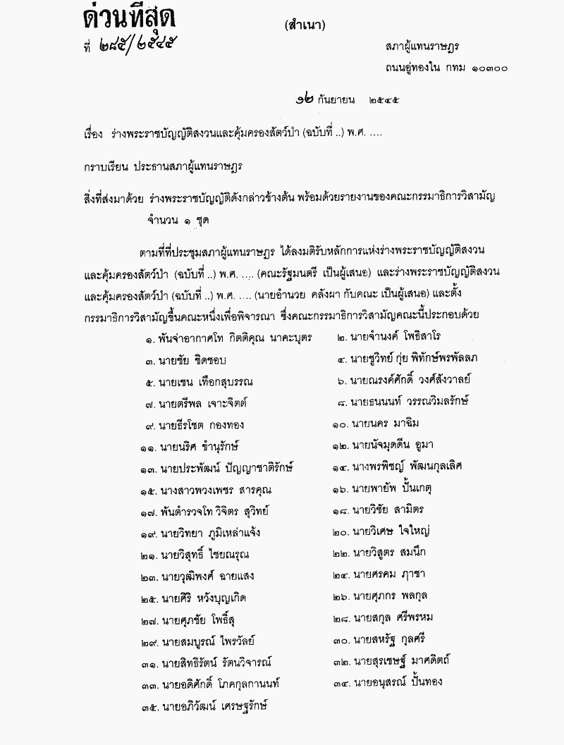 • ร่างพระราชบัญญัติสงวนและคุ้มครองสัตว์ป่า (ฉบับที่..) พ.ศ. .... ซึ่งคณะกรรมาธิการวิสามัญพิจารณาเสร็จแล้ว