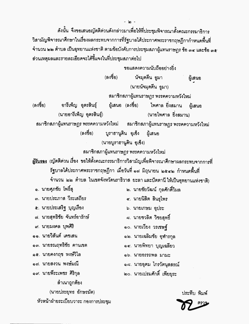 ขอเสนอญัตติด่วน เรื่อง ขอให้ตั้งคณะกรรมาธิการวิสามัญเพื่อพิจารณาศึกษาผลกระทบจากการที่รัฐบาลได้ประกาศพระราชกฤษฎีกา เมื่อวันที่ 17 มิถุนายน 2542 กำหนดพื้นที่จำนวน 22 ตำบล ในเขตจังหวัดนราธิวาส ยะลา และปัตตานีให้เป็นอุทยานแห่งชาติ |