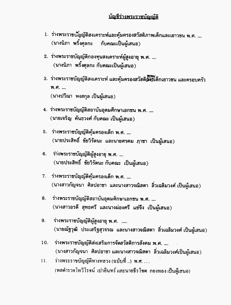 • ร่างพระราชบัญญัติสงเคราะห์และคุ้มครองสวัสดิภาพเด็กและเยาวชน พ.ศ..... (นางนิภา พริ้งศุลกะ กับคณะ เป็นผู้เสนอ)(เป็นร่างพระราชบัญญัติที่มีสาระเกี่ยวกับเด็ก ตามมาตรา 190 ของรัฐธรรมนูญแห่งราชอาณาจักรไทย)