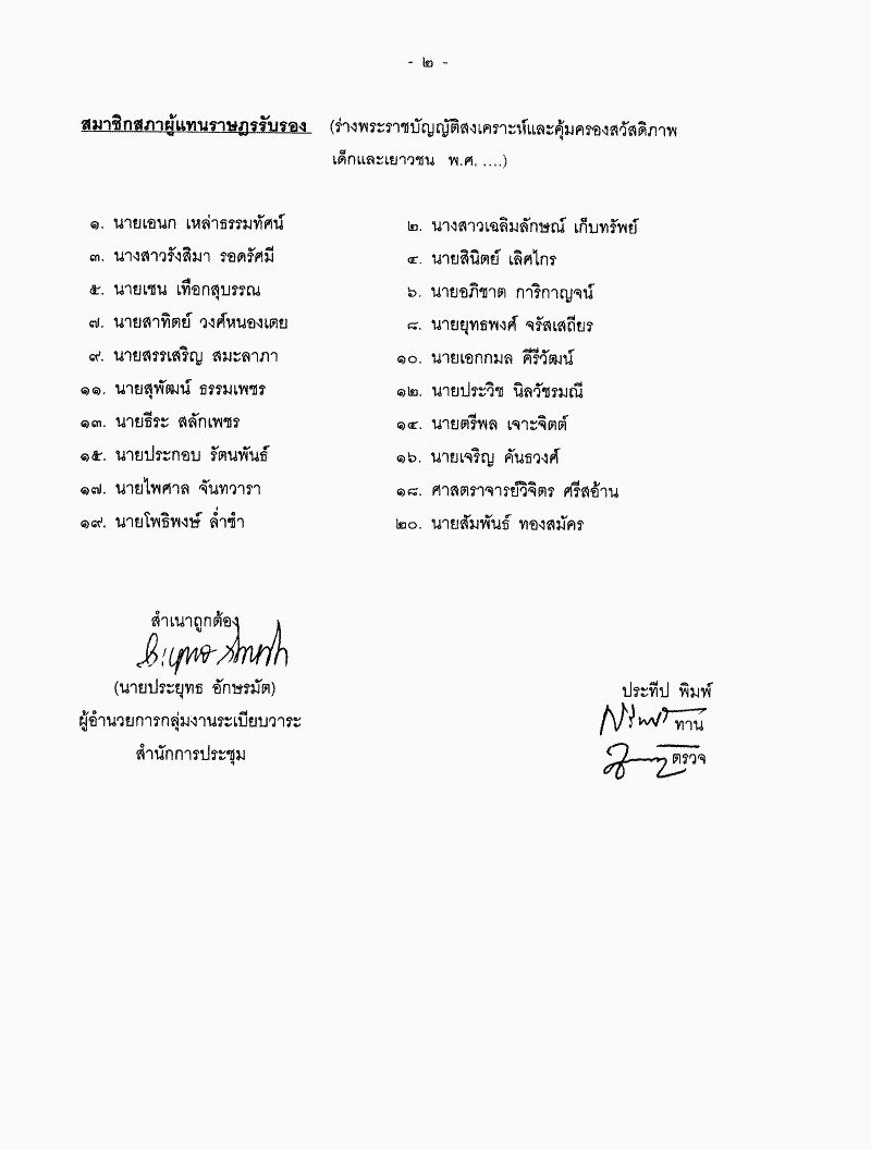 • ร่างพระราชบัญญัติสงเคราะห์และคุ้มครองสวัสดิภาพเด็กและเยาวชน พ.ศ..... (นางนิภา พริ้งศุลกะ กับคณะ เป็นผู้เสนอ)(เป็นร่างพระราชบัญญัติที่มีสาระเกี่ยวกับเด็ก ตามมาตรา 190 ของรัฐธรรมนูญแห่งราชอาณาจักรไทย)